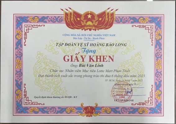 BGĐ Tập đoàn Vệ sỹ Hoàng Bảo Long tặng Giấy khen nhân viên đạt thành...