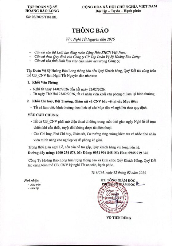 Tin tứcLỊCH NGHỈ TẾT NGUYÊN ĐÁN 2026Tập Đoàn Vệ Sỹ Hoàng Bảo Long thông báo lịch nghỉ Tết Bính Ngọ 2026 Đánh giá ngay post Hoàng Bảo Long hợp tác cùng Tập đoàn IGC triển khai nhiệm vụ bảo vệ tại Trường TH, THCS và THPT Tân Phú